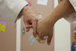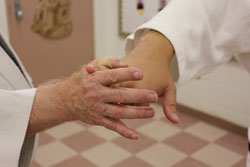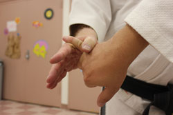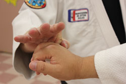 This series of pictures shows the little-finger figure-4 brace in various positions, using both your left hand and your right hand. [I personally prefer my right.] It probably works best with right to right hand and left to left hand. What is important is that your digit closest to your opponent's hand presses down as your second digit serves as a base. It almost works like a jutte. As long as you can maintain the pressure you can move the opponent's hand [and thus his body] as you wish up or down. You will need to "play" with this technique to get the right feel so as to be able to maintain adequate pressure on the attacker's little finger [a figure-4 lock] to control the attacker's upward and downward movement. The complete technique can be found on pp. 171-175 of Jujitsu FIgure-4 Locks.
