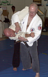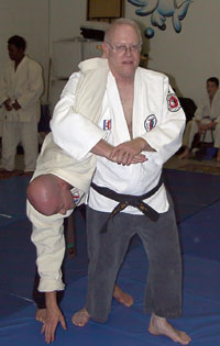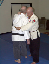 This is a defense for a knife in your back, with your back arched. Practice this defense slowly to achieve smoothness. It is an extremely fast technique once proficiency is achieved because your constantly working in a circle. Be careful though. You can't complete this technique without posing the risk of serious injury to your workout partner. Be sure to check my footwork as you learn this technique. Footwork is always critical. Thanks to Sean Gallimore for being my uke and Marc Kolodziejczyk for the photography.