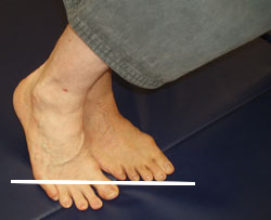 front of his leg will be against the back of my leg [at my foot]