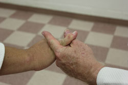 This series of pictures shows the little-finger figure-4 brace in various positions, using both your left hand and your right hand. [I personally prefer my right.] It probably works best with right to right hand and left to left hand. What is important is that your digit closest to your opponent's hand presses down as your second digit serves as a base. It almost works like a jutte. As long as you can maintain the pressure you can move the opponent's hand [and thus his body] as you wish up or down. You will need to "play" with this technique to get the right feel so as to be able to maintain adequate pressure on the attacker's little finger [a figure-4 lock] to control the attacker's upward and downward movement. The complete technique can be found on pp. 171-175 of Jujitsu FIgure-4 Locks.
