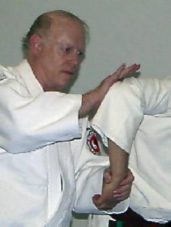 and then deal exclusively with the attacker's right elbow, using a Mae Heji Maki